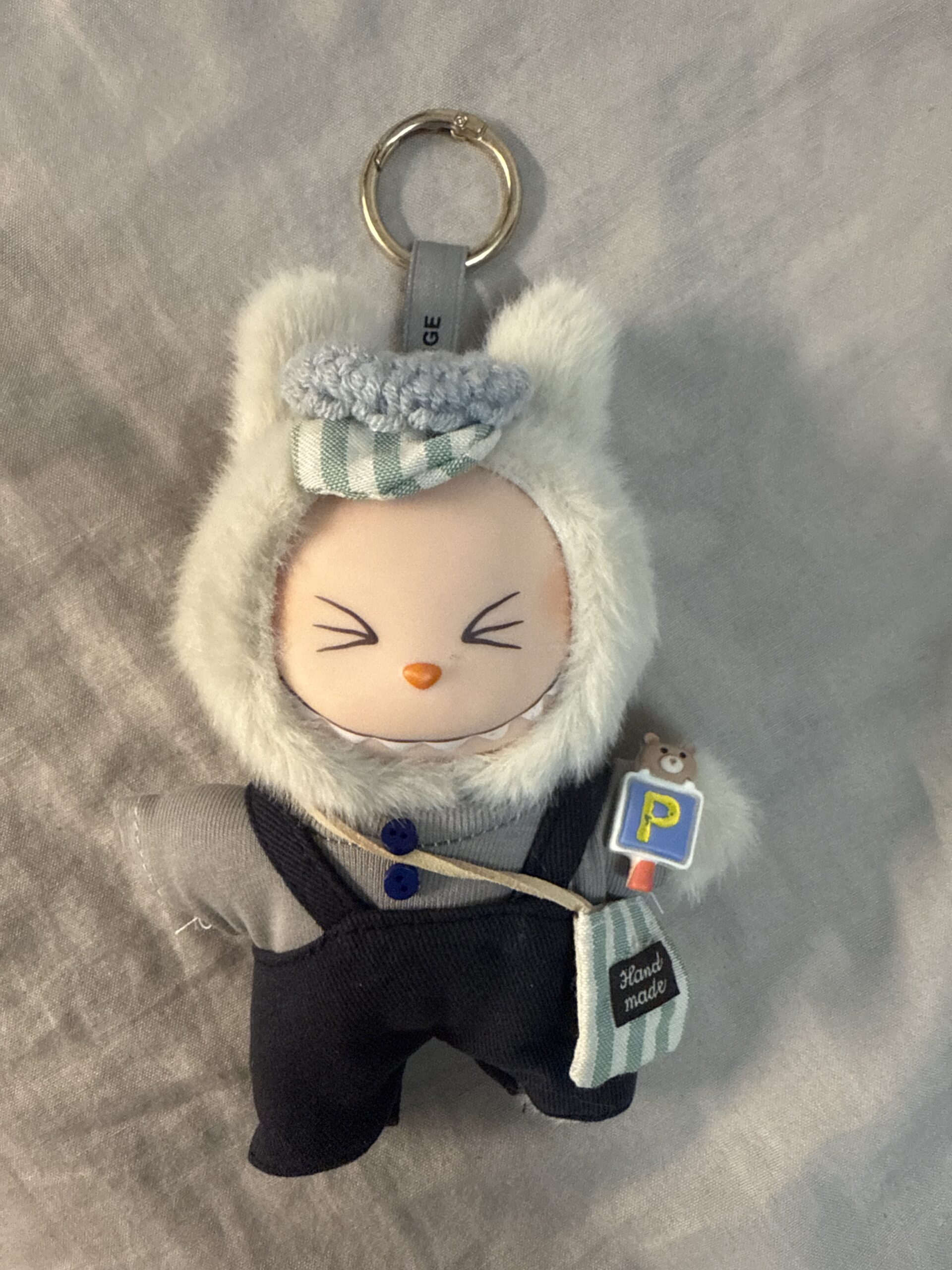 Conçu avec une attention particulière aux détails, Labubu se distingue par sa tenue bleue soigneusement cousue, son bonnet moelleux et son mini sac « handmade » qui lui confère une touche d’authenticité.